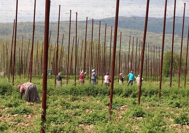 Topraktan çıkan bitkinin sarılması için sırıklara iplikleme işlemini yapan çiftçiler, bölgeye yeterli yağış düşmesinden dolayı geçen yıl olduğu gibi bu sene de yüksek rekolte bekliyor.