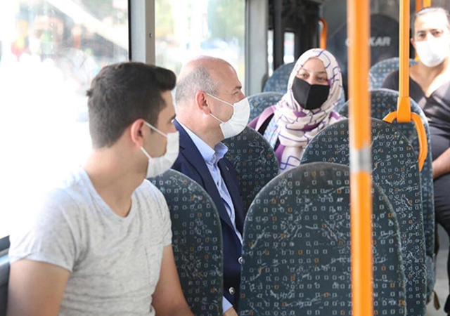 Otobüsteki koronavirüs tedbirlerini inceleyen ve yolcularla sohbet eden Soylu, "Eğer kurallara uymazsak sonuç iyi olmaz" dedi.