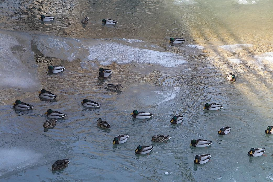 Şehir merkezini ikiye bölen nehrin yer yer buzla kaplanan yüzeyindeki ördekler, bulundukları ortama ayrı bir güzellik katıyor.