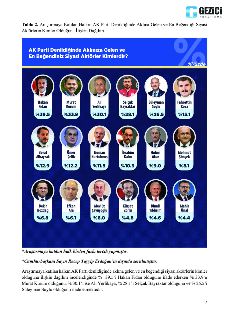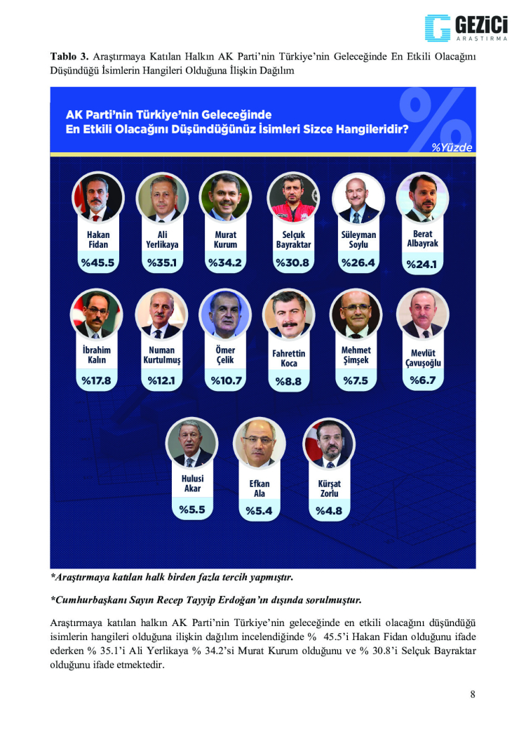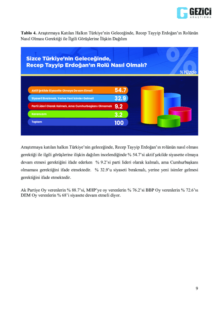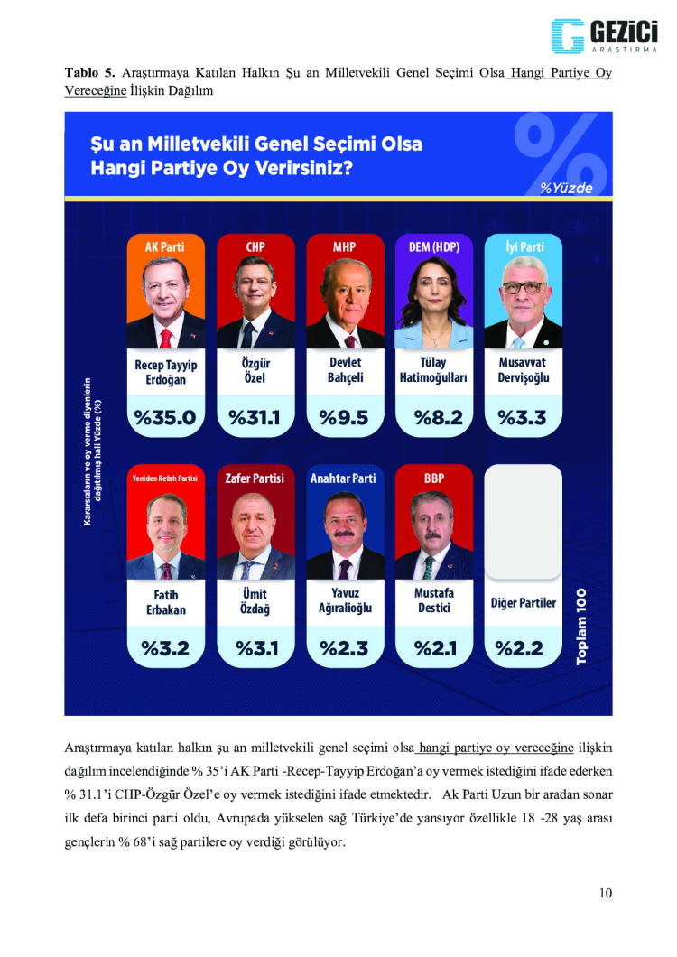Gezici araştırmanın son yapılan ankete göre, "Bu pazar seçim olsa" AK Parti %35 ile birinci parti konumunu koruyor, CHP ise %31,1 ile ikinci sırada yer alıyor. Gençlerin %68’i sağ partilere yönelirken, seçmenlerin %54,7’si Cumhurbaşkanı Erdoğan’ın siyasette aktif kalmasını istiyor.