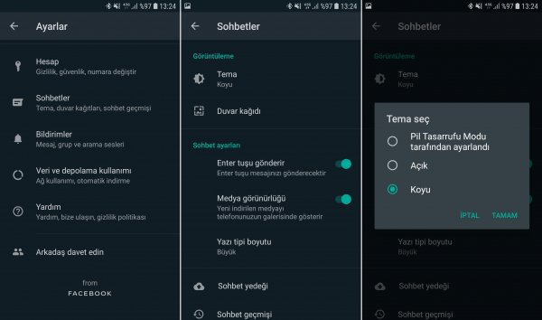 WhatsApp'ı açın, sağ üstteki üç noktalı menüden 'Ayarlar' seçeneğine dokunun. Sohbetler menüsüne girerek sayfanın en üstünde bulunan 'Tema' kısmından 'Koyu'yu seçin.