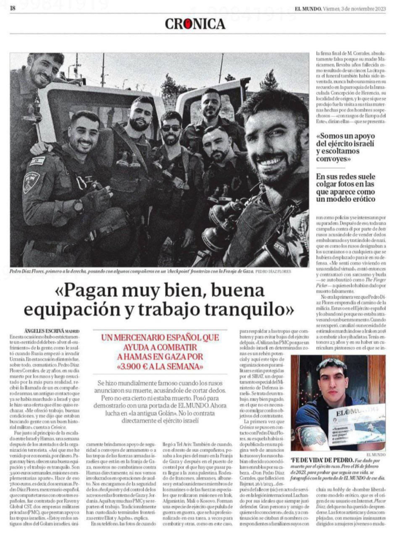 İspanya'da yayın yapan El Mundo gazetesinde 3 Kasım'da çıkan bir haberde, Gazze Şeridi'ne yönelik saldırılarında İsrail saflarında savaştığı öne sürülen İspanyol uyruklu Pedro Diaz Flores isimli birinin açıklamalarına yer verilmişti.