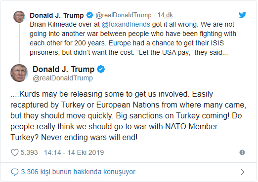 Trump, Türkiye'yi çok büyük yaptırımlar geleceğini ifade ederek, ‘' İnsanlar gerçekten NATO üyesi Türkiye ile savaşa girmemiz gerektiğini mi düşünüyor? Asla bitmeyen savaşlar bitecek'' şeklinde paylaşımda bulundu.
