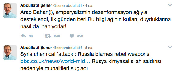 AK Parti'den ayrıldıktan sonra siyasette dikiş tutturamayan, kendi kurduğu Türkiye Partisi'ne kilit vuran Şener, battıkça batılyor. Son olarak referandumda 'hayır' kampanyasında sahne alan Şener, dünyayı ayağa kaldıran Esad rejiminin korkunç kimyasal saldırısını aklama çabasına girdi. Şener, ayrıca Rusya'nın muhalifleri suçladığı son açıklamasına yer verdi.