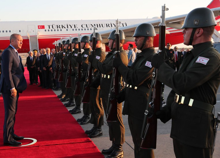 Başkan Erdoğan, Ercan Havalimanı'nda, KKTC Meclis Başkanı Teberrüken Uluçay, Başbakan Tufan Erhürman, Enerji ve Ekonomi Bakanı Özdil Nami, Başbakan Yardımcısı ve Dışişleri Bakanı Kudret Özersay ile Türkiye'nin Lefkoşa Büyükelçisi Derya Kanbay tarafından karşılandı.