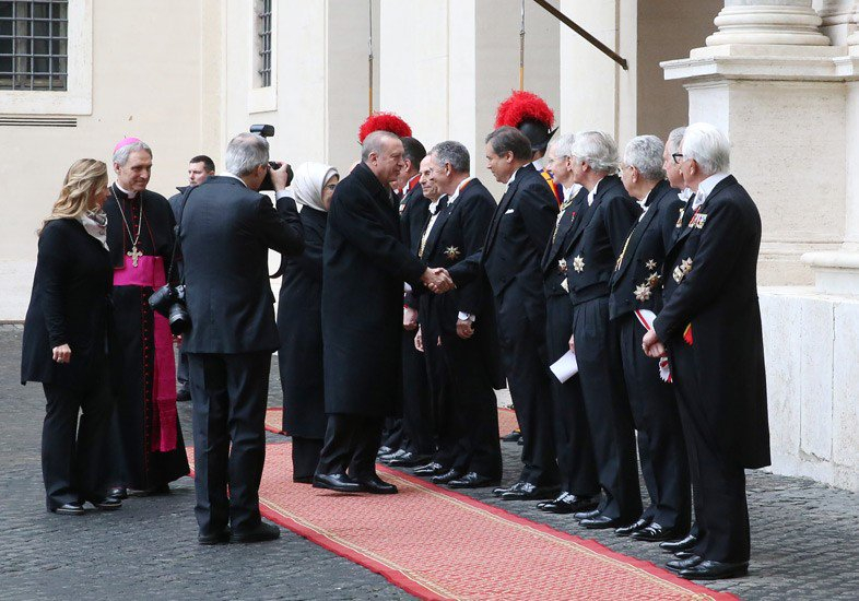 Erdoğan için, Katoliklerin ruhani lideri Papa Franciscus ile baş başa görüşmek üzere geldiği Apostol Sarayı önünde tören düzenlendi.