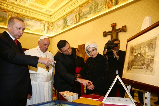 Erdoğan ve Papa, sunulan hediyeler hakkında birbirlerine bilgi verdi.