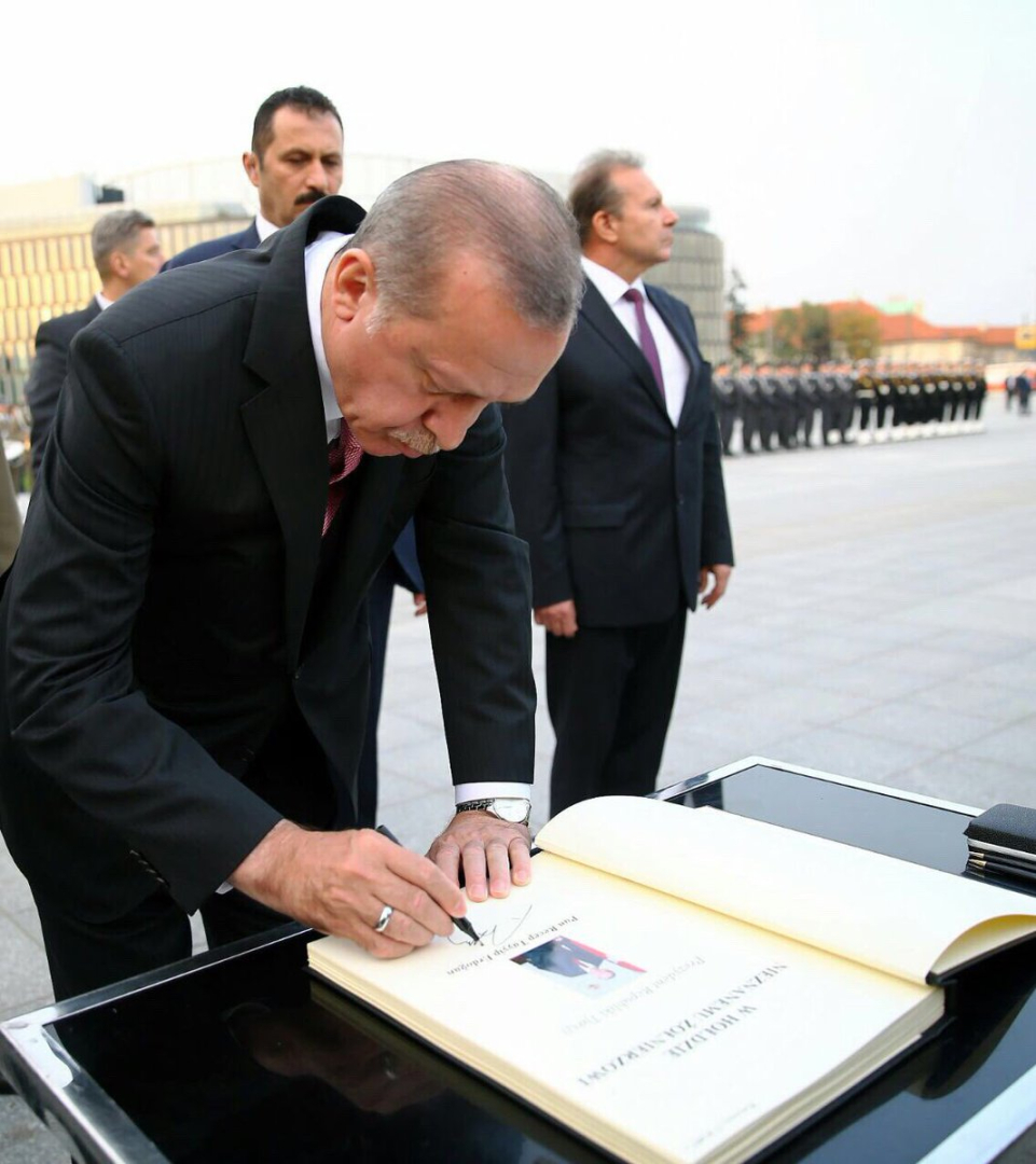 Cumhurbaşkanı Erdoğan, resmi temaslarının ardından Meçhul Asker Anıtı'na geçti. İstiklal Marşı'nın çalınmasının ardından anıta çelenk bırakan Erdoğan, daha sonra anıt defterini imzaladı.