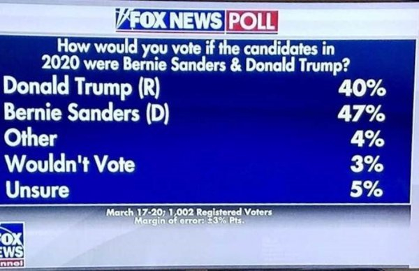 ABD Başkanı Donald Trump'a yakınlığı ile bilinen FOX News haberinde yayınlanan son ankette ise Bernie Sanders'ın Trump'tan 7 puan önde olduğu görülüyor.