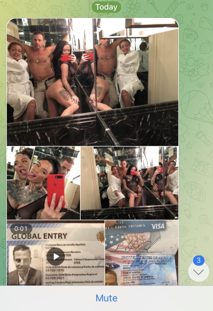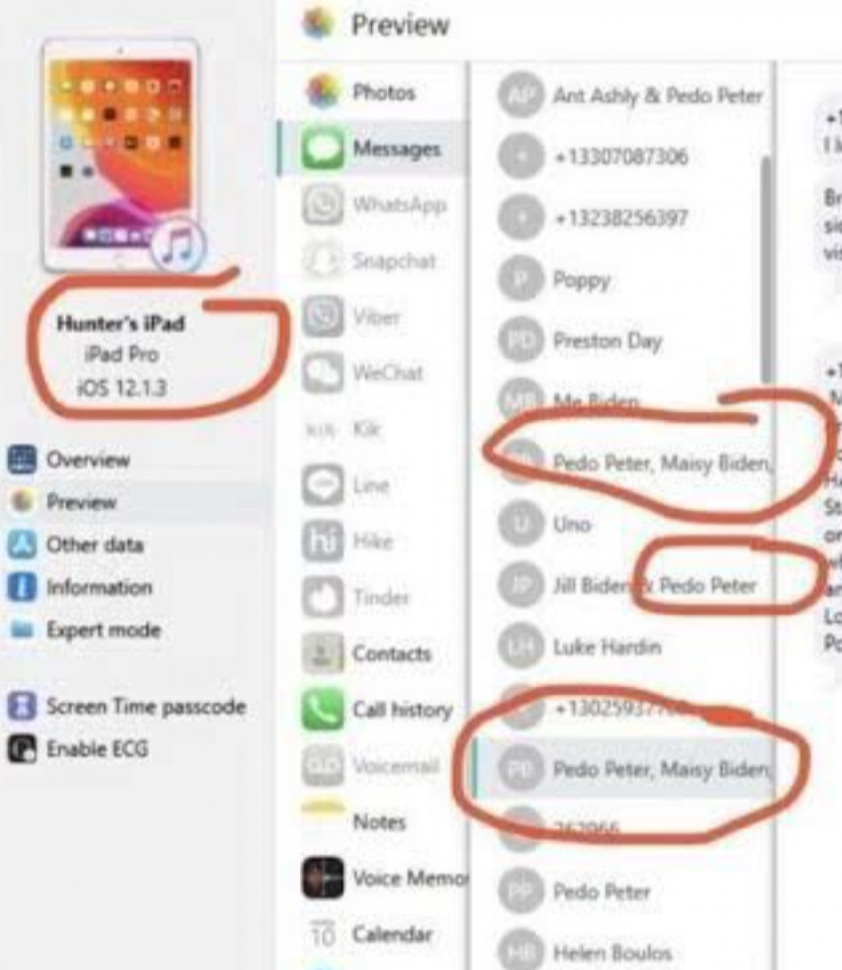 Hunter Biden'ın uyuşturucu kullanımı, yasa dışı para transferleri ve silahlarla ilgili mesajlarının ekran görüntülerini içeren bir takım görüntüleri internete yayıldı. Kullanıcılar, Hunter Biden'ın ABD Başkanı Biden'ı "Pedofili Peter" adıyla telefon kişi listesine kaydettiğini de iddia etti.