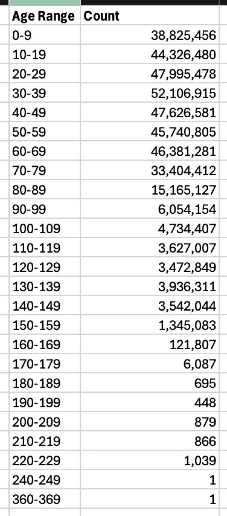 Bunun yanı sıra, tabloda 150 ile 159 yaşları arasında yer alan 1 milyondan fazla kişinin bulunduğu ve 1 kişinin yaşının ise 360'ın üzerinde olduğu bilgisi öne çıktı.