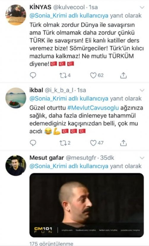 Dışişleri Bakanı Mevlüt Çavuşoğlu'nun cümlelerinin ardından toplantı salonunu anında terk eden Fransız parlamenter Sonia Krimi, sosyal medyadaki Twitter hesabından da Türk kullanıcılardan hak ettiği cevapları aldı. Kullanıcılar Sonia'ya adete ateş püskürdü.