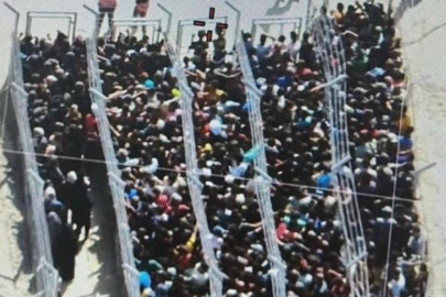 Fotoğrafta, çok sayıda Filistinlinin kafes şeklindeki tel örgülerle ayrılmış bölümlerde bekletildiği görülüyor.