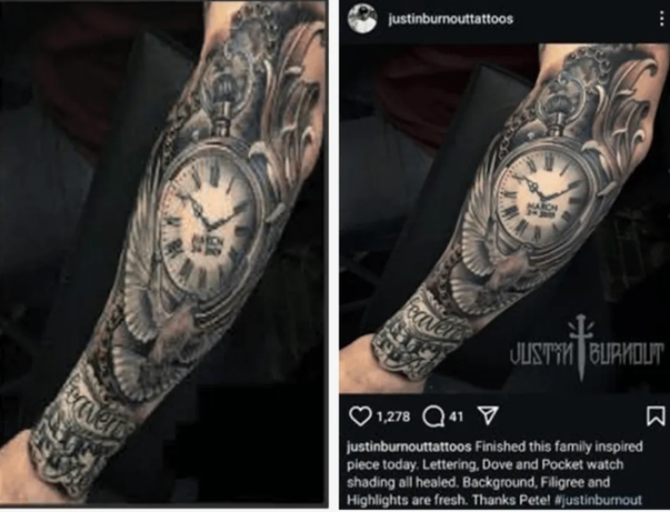 BBC Verify ekibi tarafından yapılan tersine görsel arama, Belton’un dövmesinin aslında 2016 yılında Nottingham merkezli bir dövme sanatçısı tarafından sosyal medyada paylaşıldığını ortaya çıkardı. ABD İç Güvenlik Bakanlığı belgesindeki görsel, bu paylaşımın daha düşük kaliteli bir versiyonu.
