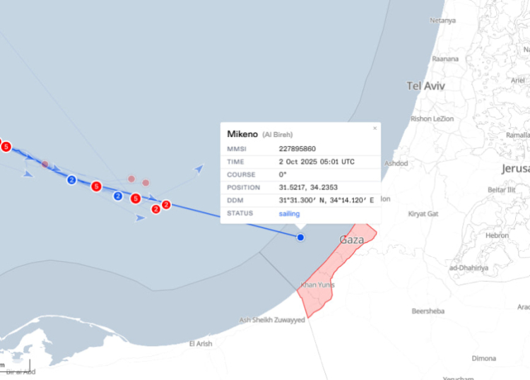 “Mikeno” adlı bir teknenin Gazze’nin kara sularında bulunduğunu gösteriyor. Ancak geminin İsrail güçlerince durdurulup durdurulmadığı henüz belirsiz.