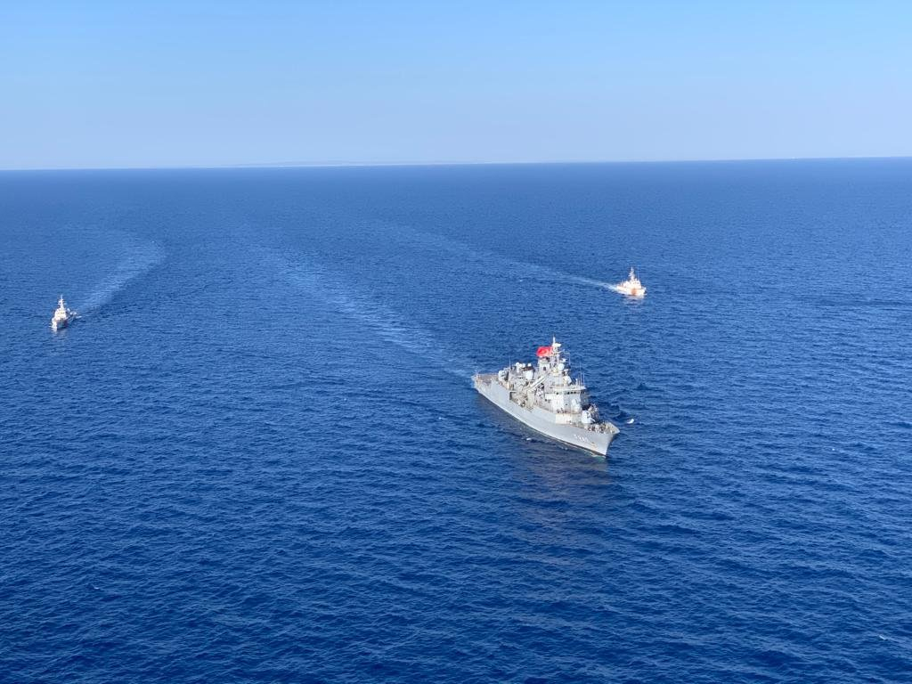 "Akdeniz Kalkanı Harekatına katılan TCG KEMALREİS fırkateyni Akdeniz'de Kıbrıs Adası doğusunda Kuzey Kıbrıs Türk Cumhuriyeti sahil güvenlik gemileriyle deniz eğitimlerini müteakip BARBAROS HAYRETTİN PAŞA araştırma gemimize refakat etmektedir."