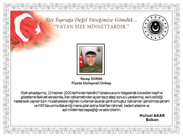 Hakkari Yüksekova'da, İran'daki teröristlerce açılan taciz ateşinde yaralanan kahraman Mehmetçik Piyade Sözleşmeli Onbaşı Recep Durak, hastanedeki müdahalelere rağmen kurtarılamayarak şehit oldu.
