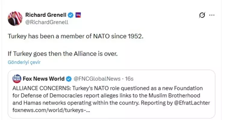 Grenell, sosyal medya üzerinden yaptığı açıklamada, "Türkiye 1952'den beri NATO üyesidir. Eğer Türkiye giderse, ittifak biter" ifadelerini kullanarak, Ankara'nın ayrılığının NATO'nun sonunu getirecek bir jeopolitik kırılma olacağını hatırlattı.