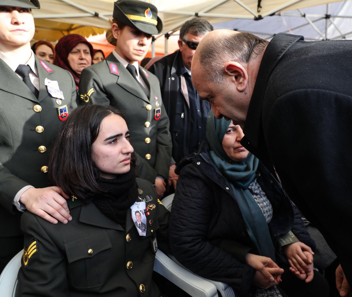 Şehidin eşi Hafize Nur'un tören alanına eşine ait üniformayla geldiği görüldü. Şehidin annesi ve kız kardeşi ayakta güçlükle durdu.