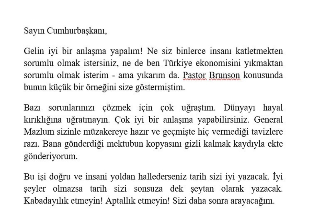 "İyi bir anlaşma için çalışalım, binlerce kişinin katledilmesinden sorumlu olmak istemiyorsun, ben de ekonomini mahvetmekten sorumlu olmak istemiyorum, ederim de. Sorunlarının bazılarını çözmek için çok çalıştım, dünyaya hayal kırıklığı yaşatma. Harika bir anlaşma yapabilirsin. General Mazlum müzakere etmek istiyor, geçmişte vermediği tavizleri vermeye niyetli. Bana gönderdiği mektubun kopyasını, gizli olmak kaydıyla iliştiriyorum. Bunu insani yolla yapabilirsen tarih senden yana olur fakat iyi şeyler olmazsa sonsuza dek şeytan olarak görüleceksin. Sert adam olma, aptal olma."