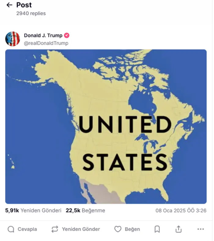 Trump, uzun süredir Kanada'nın ABD'ye dahil edilmesi gerektiğini savunuyor. Paylaştığı haritada, Kanada ve ABD tek bir ülke olarak gösterildi. Trump, "Biz onlardan daha fazlasına sahibiz ve onların hiçbir şeyine ihtiyacımız yok. O zaman neden Kanada'yı korumak için yılda 200 milyar dolar kaybediyoruz?" diyerek Kanada'nın ABD'ye katılması gerektiğini ifade etmişti.