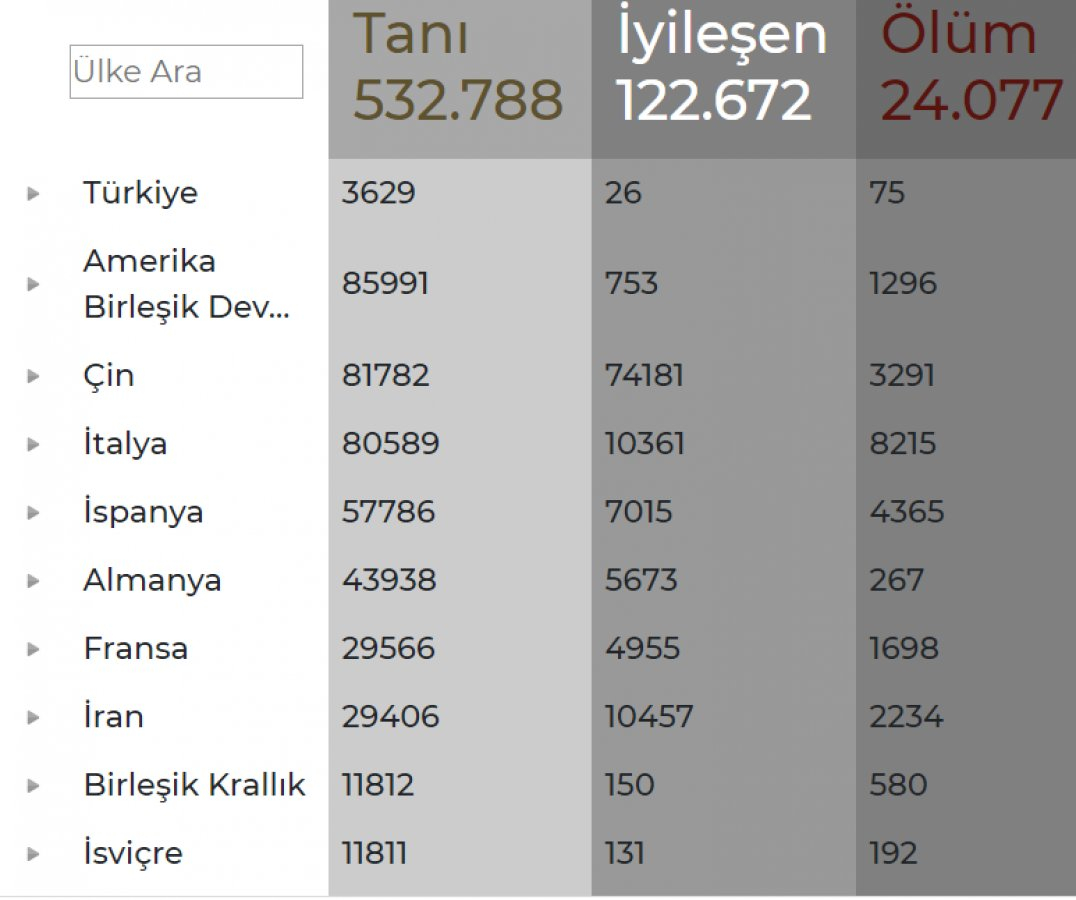 Türkiye'deki verilerde iyileşenler ve ölüm oranı yer alıyor.