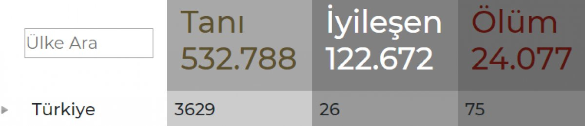 Son bilgilere göre Türkiye'de, koronavirüs olan 3 bin 629 kişi var. 26 kişinin iyileştiği ve 75 kişinin de hayatını kaybettiği bilgisi öğreniliyor.