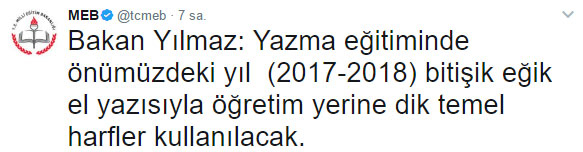 “Yazma eğitiminde önümüzdeki yıl (2017-2018) bitişik eğik el yazısıyla öğretim yerine dik temel harfler kullanılacak.”
