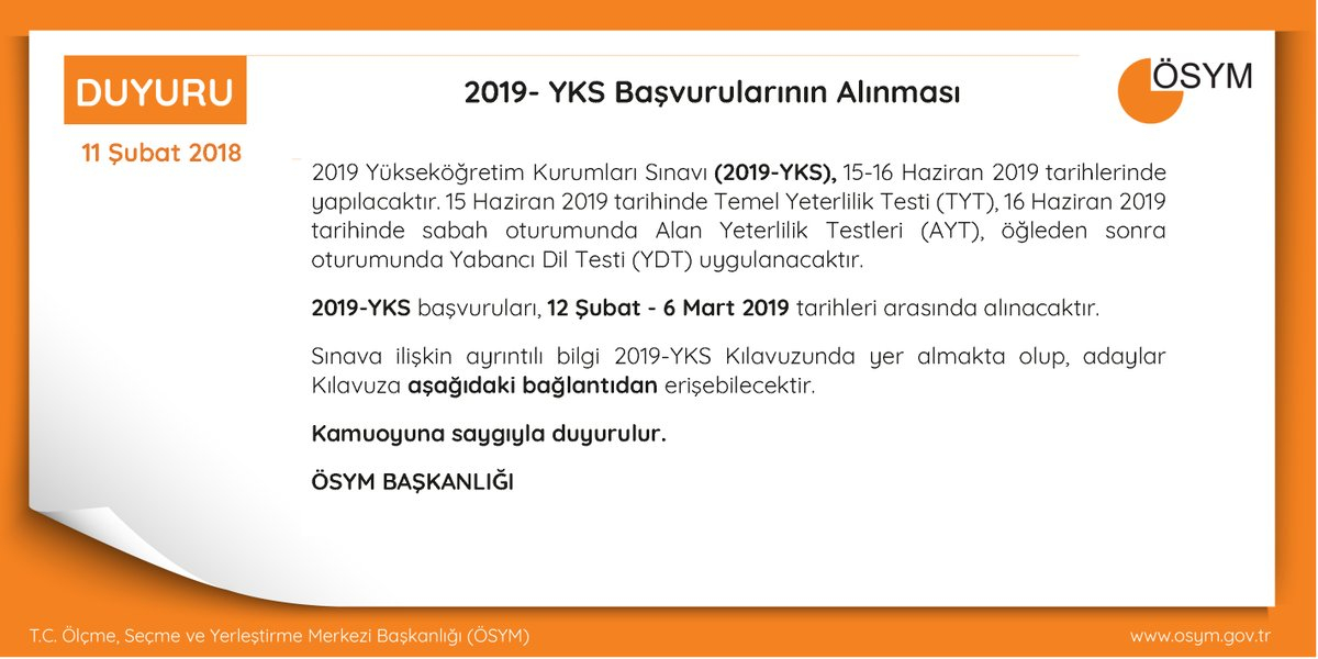 Sınavla ilgili tüm ayrıntılı bilgiler, ÖSYM'nin resmi sitesinde bulunan bağlantıdan ulaşılabilecek 2019-YKS Kılavuzu'nda yer almakta.