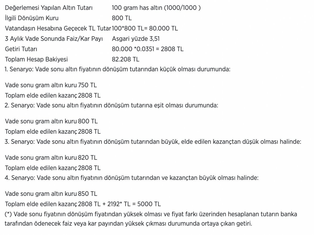 Vatandaşın fiziki altınını rafinerilerin kuyumcu ağları veya bankaya teslim edip altın dönüşümlü TL mevduat ve katılım mevduat hesabı açtırmaları halindeki senaryo örnekleri şöyle: