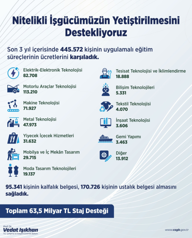 "İhtiyaç duyulan stratejik öneme sahip alanlarda nitelikli işgücümüzü yetiştiriyoruz. İŞKUR aracılığıyla son 3 yılda 445 bin 572 kişiye 63,5 milyar TL Staj Desteği sağladık.Toplamda 95 bin 341 kişinin kalfalık belgesi, 170 bin 726 kişinin ustalık belgesi almasını sağladık.