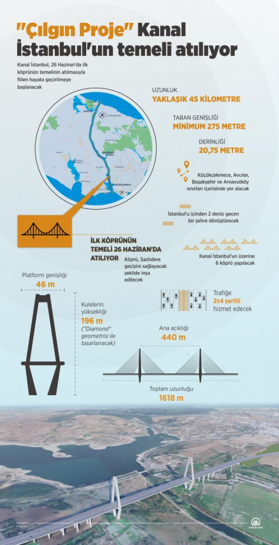 İstanbul'u içinden 2 deniz geçen bir şehre dönüştürecek Kanal İstanbul'un üzerine 6 köprü yapılacak. Kanal İstanbul'un her iki tarafında 250 biner konutluk devasa şehirler kurulması planlanıyor.