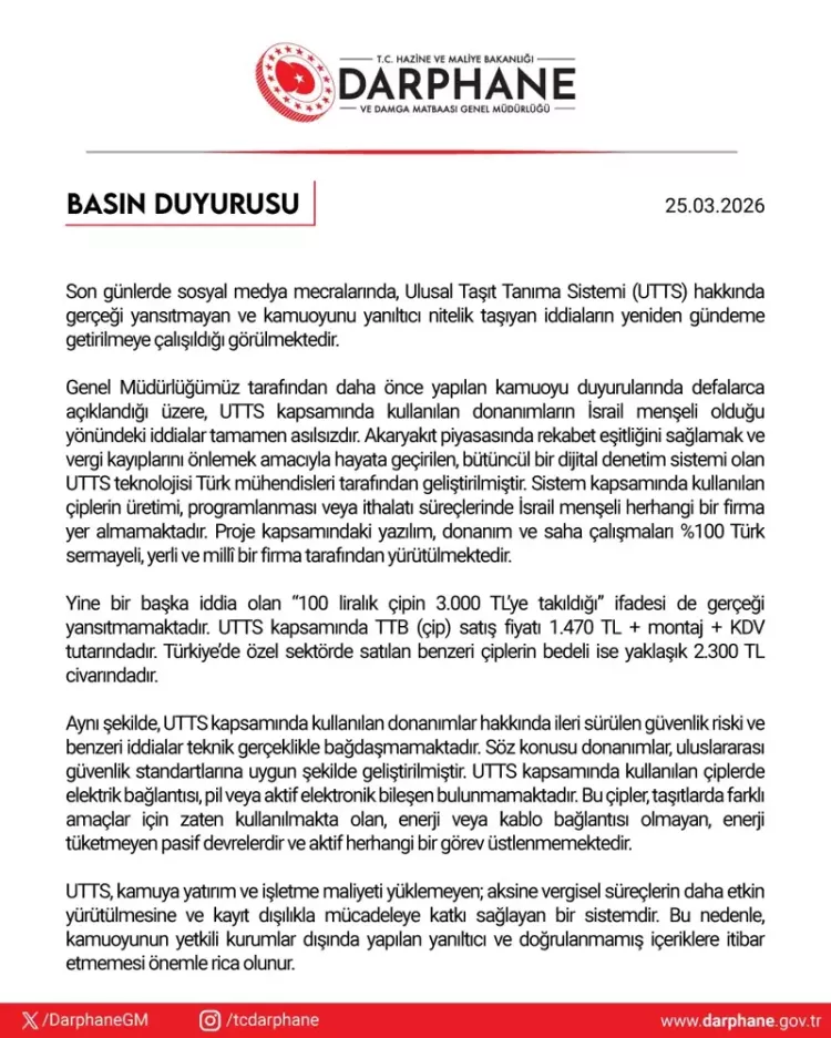Darphane ve Damga Matbaası Genel Müdürlüğü, Ulusal Taşıt Tanıma Sistemi (UTTS) kapsamında kullanılan donanımların İsrail menşeli olduğu yönündeki iddiaların asılsız olduğunu bildirdi.