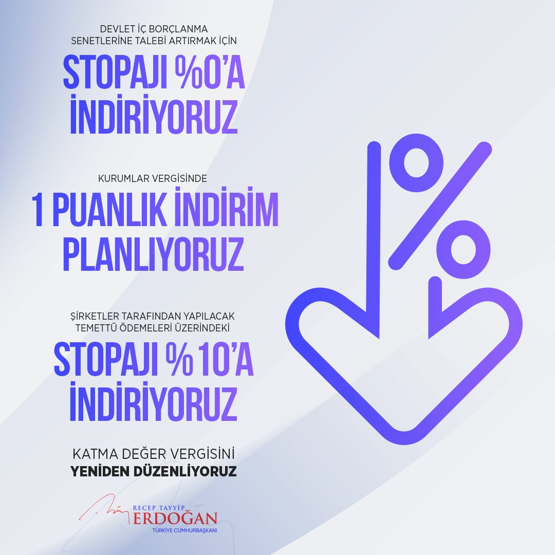 Kurum kazançları üzerindeki vergi yükünü azaltarak uluslararası rekabeti desteklemek ve yatırımı teşvik etmek amacıyla ihracat ve sanayi şirketleri için kurumlar vergisinde bir puanlık indirim planlıyoruz."