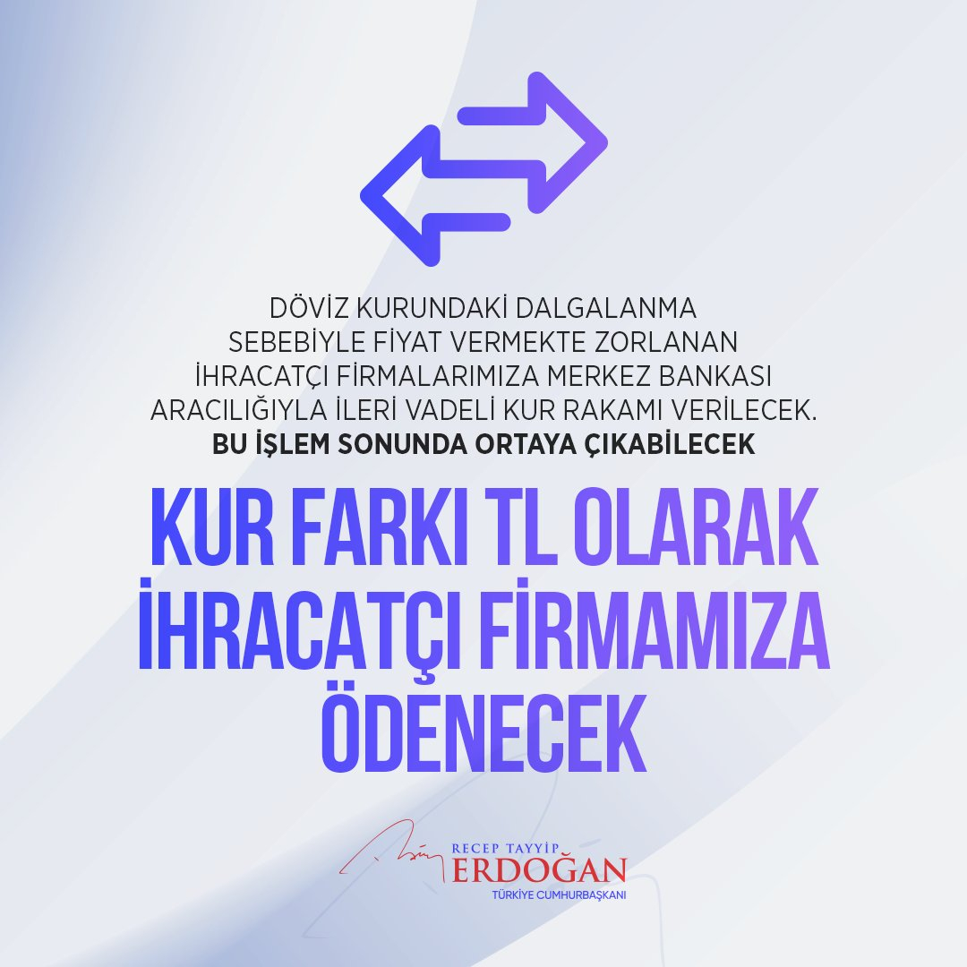 "Bir müjdemiz de ihracatçılarımıza var. Döviz kurundaki dalgalanma sebebiyle fiyat vermekte zorlanan ihracatçı firmalarımıza doğrudan Merkez Bankası aracılığıyla ileri vadeli kur rakamı verilecek. Bu işlem sonunda ortaya çıkabilecek kur farkı ise TL olarak ihracatçı firmamıza ödenecek."