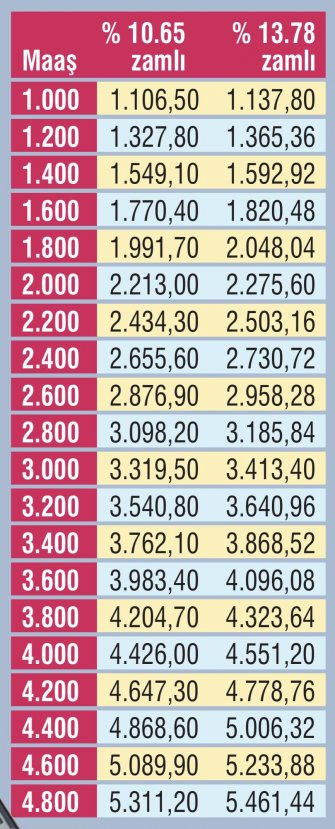 Diğer taraftan Merkez Bankası'nın enflasyon tahmini olan yüzde 13.78'lik oran maaşları 140 ile 674 lira arasında yükseltecek.