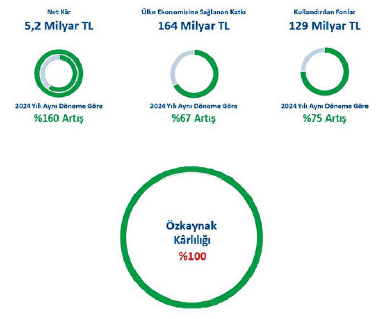 Net kârını %160 artırarak 5,2 Milyar TL seviyesine taşıyan Emlak Katılım, aktif büyüklüğünü 246 Milyar TL’ye ulaştırırken; toplanan fonlarını 175 Milyar TL’ye yükseltti. Aynı dönemde kullandırılan fon büyümesi %75 düzeyinde gerçekleşirken, %1,05 seviyesindeki takibe dönüşüm oranı ve %22,76’lık sermaye yeterliliği oranı ile sektördeki sağlam duruşunu pekiştirdi.