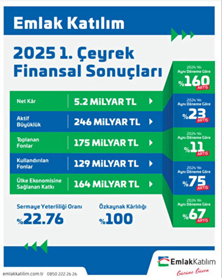 Reel ekonomiye sağladığı katkı, müşteri odaklı hizmet anlayışı ve sürdürülebilir finans yaklaşımıyla Türkiye ekonomisine değer katan Emlak Katılım, 2025 yılına güçlü bir başlangıç yaptı. Faaliyet gösterdiği alanlarda verimlilik ve sürdürülebilirliği merkeze alan Emlak Katılım, 2025 yılı ilk çeyreğinde ülke ekonomisine 164 Milyar TL’lik kaynak aktararak geçen yılın aynı dönemine göre %67’lik bir büyüme yakaladı. Emlak Katılım 2025 1. çeyrek finansal verileri.