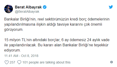 "Bilindiği üzere Türkiye Bankalar Birliği (TBB), 17 Ağustos 2018 tarihinde ekonomik faaliyetin desteklenmesine yönelik olarak yapılabileceklere ilişkin, takdiri üyelerimize ait olmak üzere tavsiye niteliğinde karar almış ve üyeler ile paylaşmıştır.