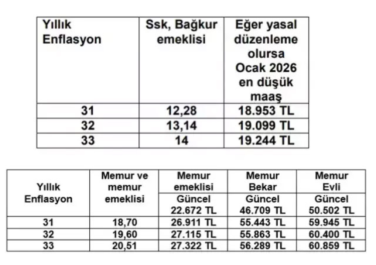 Mevcut durumda 16.881 TL olan en düşük emekli maaşı, eğer %12.28 oranında zam yapılırsa 18.953 TL’ye yükselebilir. Eğer zam oranı %13.14 olursa, taban aylık 19.099 TL seviyesine ulaşır. Son olarak %14 zam olması durumunda, yeni yılda en düşük emekli maaşı 19.244 TL’ye çıkacaktır.