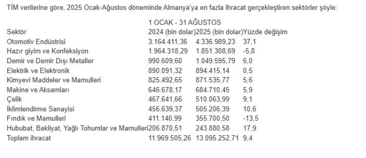 Ülkeye iklimlendirme sanayisi 505,2 milyon dolarlık, çelik sektörü 510,1 milyon dolarlık dış satım gerçekleştirdi. Yılın 8 ayında Almanya'ya İstanbul'dan 5,1 milyar dolarlık, Bursa'dan 1,7 milyar dolarlık, Kocaeli'den 1,6 milyar dolarlık, İzmir'den 954,3 milyon dolarlık, Ankara'dan 674,9 milyon dolarlık ihracat gerçekleşti.