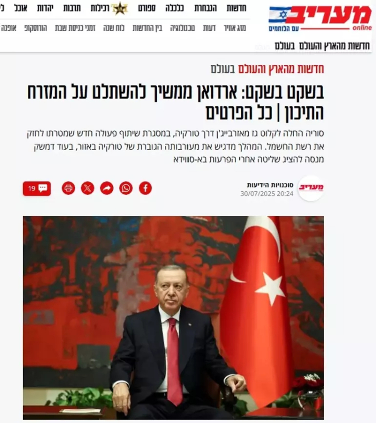 İsrail'in önde gelen gazetelerinden Maariv, Bakan Bayraktar'ın Türkiye'nin Suriye'deki enerji altyapısını yeniden inşa etme sürecinde aktif bir sorumluluk üstlendiğini açıklamasının ardından "Sessiz sedasız: Erdoğan Orta Doğu'daki etkisini artırıyor" başlıklı bir haber yayımladı.