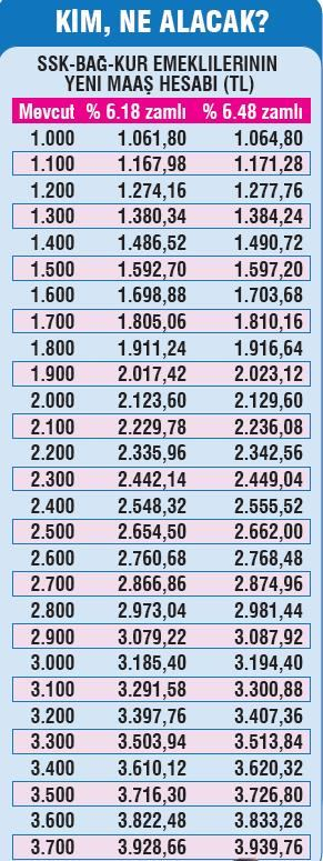 Temmuz zammı yüzde 6.48 olarak gerçekleşirse, halen bin 500 lira olan maaş bin 597 lira 20 kuruşa yükselecek. Halen 2 bin lira olan maaş da 129,60 lira artışla 2 bin 129 lira 60 kuruşa çıkacak. 2 bin 500 lira olan maaş ise 2 bin 662 liraya ulaşacak. Emekliler Temmuz'da hem kesin zam oranlarını öğrenecek hem de zamlı maaşlarını ceplerine koyacak.