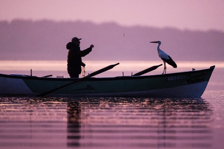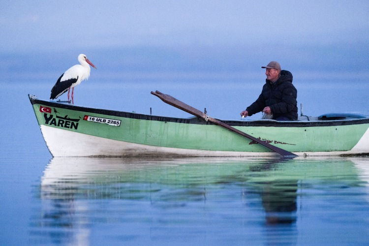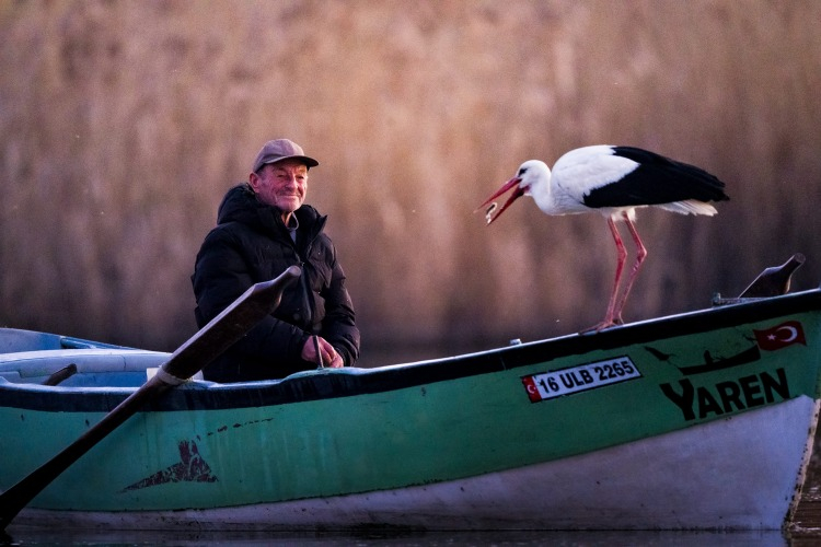 Yaren leyleğin, göl manzaralı yuvasının bulunduğu mahallede balıkçı Yılmaz'ın kayığındaki "geleneksel" pozu, doğa ve yaban hayatı fotoğrafçısı Alper Tüydeş tarafından kayda alındı.