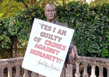 Yapılan alçak saldırıda Atatürk'ün heykelinin üstüne İngilizce olarak “Yes I am guilty of crimes against humanity!” yani "Evet, insanlığa karşı işlenen suçlardan suçluyum!" yazan bir yazı astılar.
