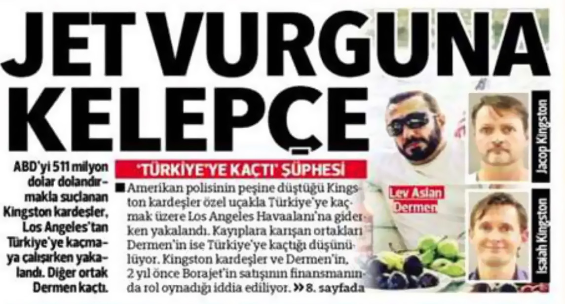 Bir gazetenin ABD muhabiri tarafından hazırlanan ve bugün söz konusu gazetede yayınlanan; ‘Jet Vurguna Kelepçe' başlıklı haberde, işadamları Lev Aslan Dermen ile Jacop ve Isaiah Kingston'un Türkiye'ye para kaçırdıkları ve ABD maliyesini 511 milyon dolar dolandırmakla suçlandıkları iddia edildi.