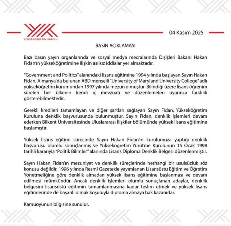 "Yüksek lisans eğitimi sürecinde Sayın Hakan Fidan'ın kurulumuza yaptığı denklik başvurusu olumlu sonuçlanmış ve Yükseköğretim Yürütme Kurulunun 15 Ocak 1998 tarihli kararıyla 'Politik Bilimler' alanında Lisans Diploma Denklik Belgesi düzenlenmiştir. Sayın Hakan Fidan'ın mezuniyet ve denklik süreçlerinde herhangi bir usulsüzlük söz konusu değildir. 1996 yılında Resmi Gazete'de yayımlanan Lisansüstü Eğitim ve Öğretim Yönetmeliği'ne göre, denklik almadan yüksek lisans eğitimine başlanması ve devam edilmesi mümkündür. Ancak denklik işlemleri olumlu sonuçlanan adaylar, denklik belgesini lisansüstü eğitimin tamamlanmasına kadar teslim etmek ve yüksek lisans eğitimlerinde de başarılı olmak koşuluyla diploma almaya hak kazanırlar."
