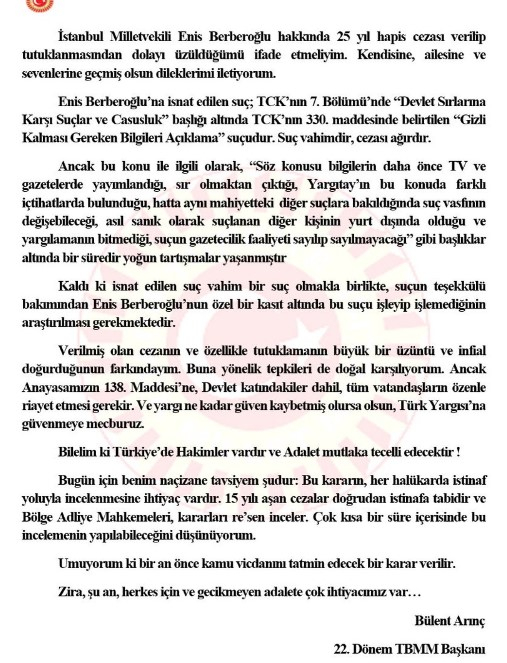 Eski TBMM Başkanı ve Başbakan Yardımcısı Bülent Arınç, CHP İstanbul Milletvekili Enis Berberoğlu'nun tutuklanmasına ilişkin Twitter'dan bir açıklama yaptı.