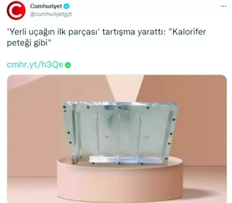 Millî muharip uçağımız KAAN muhalefet tarafından 'kalorifer peteği'ne benzetilmişti. Cumhuriyet Gazetesi 2021'de KAAN'ın üretilen ilk parçası için "Kalorifer peteği gibi!" başlığı atmıştı. Ayrıca KAAN'ı karalamak için 'kokpit camını vileda sapı ile tutturdular' yalanı da ortaya atıldı. Oysa vileda sapı dedikleri tüm dünyada kullanılan kanopiyi desteklemek için kullanılan bir güvenlik önleminden ibaretti. Yapılan bu eleştirilere rağmen yoluna devam eden KAAN bugün tüm dünyada büyük ilgi görüyor. Son olarak Endonezya ile 48 adet KAAN savaş uçağının satışına ilişkin tarihi bir sözleşme imzaladı.