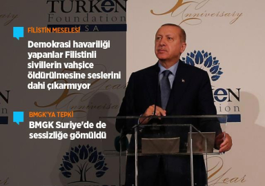 Balistik füzelerin hastanelerde, ekmek kuyruklarında, okullarda insanlar acımasızca katledilirken, istisnalar dışında bu vahşete sesini yükselten, tepki koyan olmadığını vurgulayan Erdoğan sözlerine şöyle devam etti: